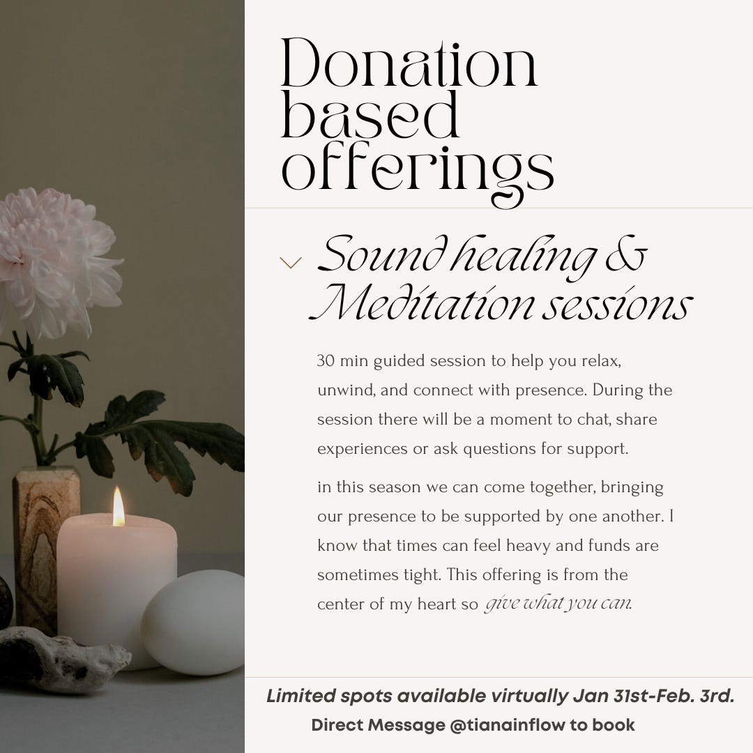 if social media isn’t your thing email me inflowwithtiana@gmail.com include in the subject line “donation based session”
